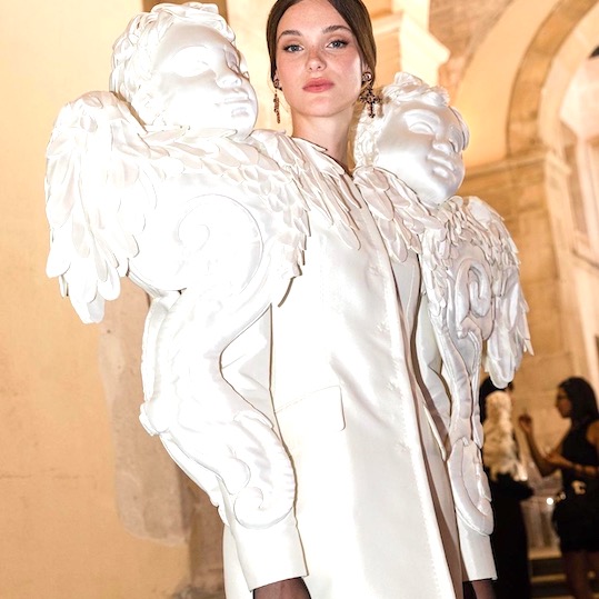 Sculptural elements, embroiders with baroque inspiration, mikado, brocade, taffeta, chiffon corset, lace veil for iconic creations of haute couture in an idyllic location called Marzamemi.