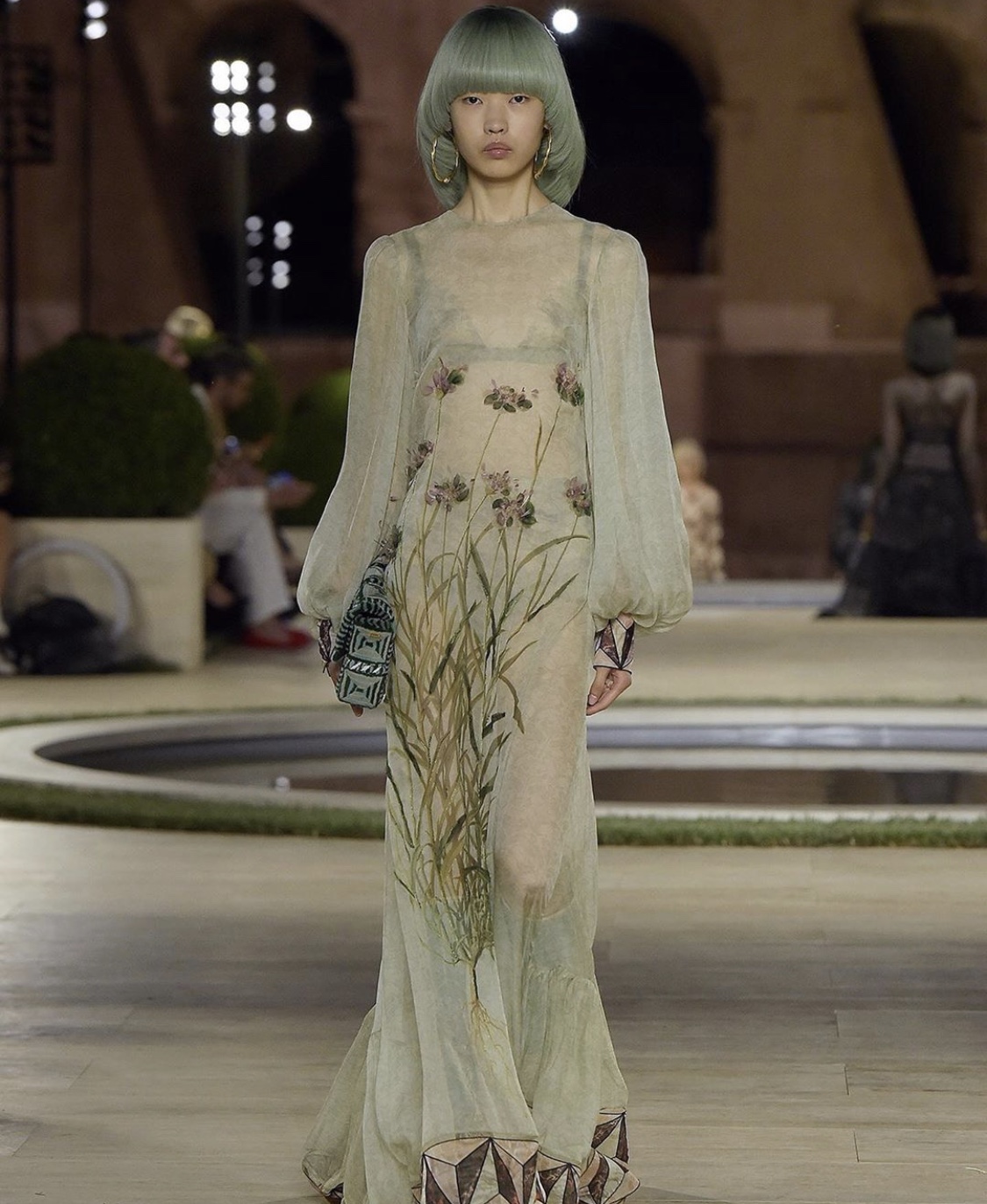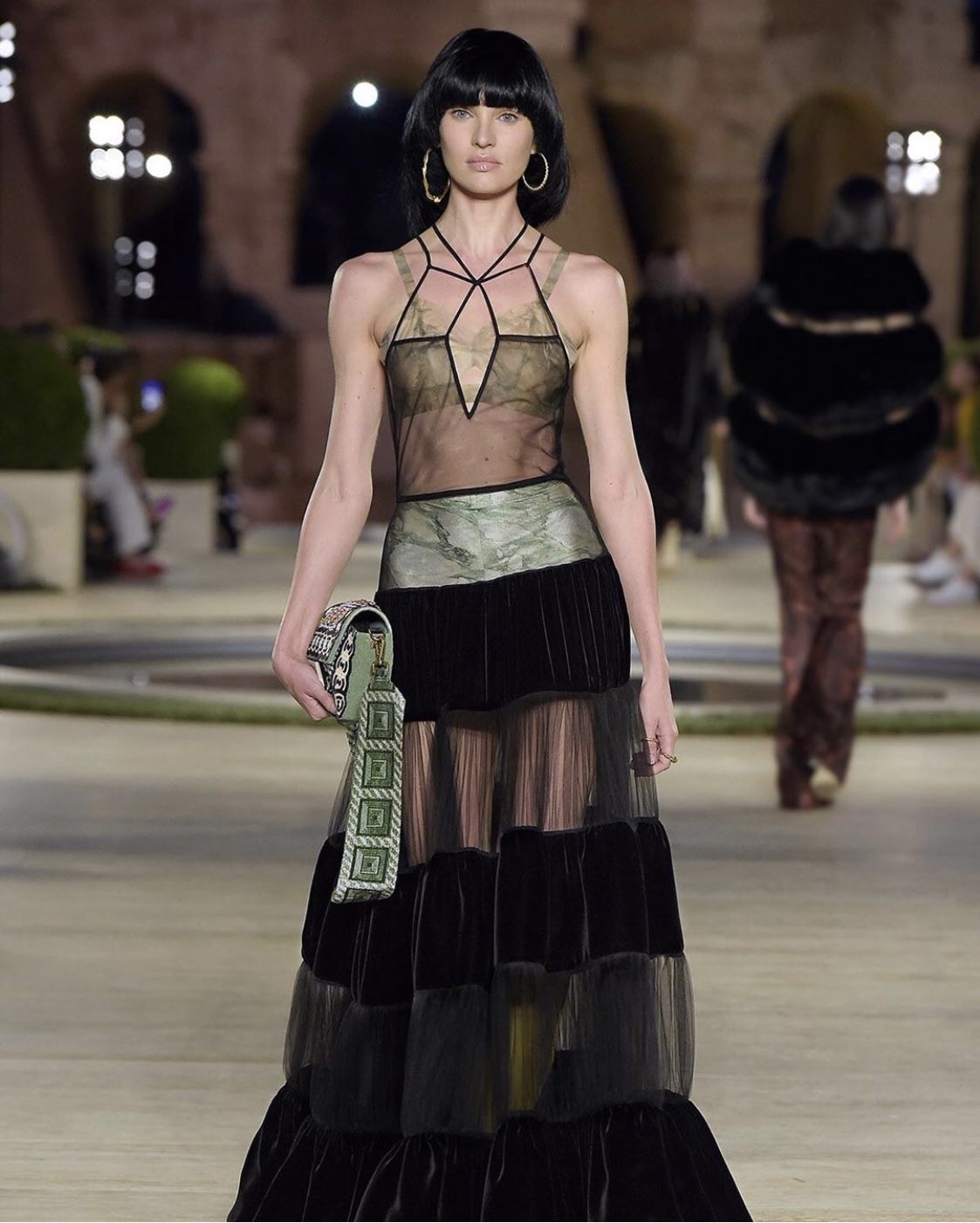 An elegant Fall 2019-20 Couture on Palatin Hill with a complex intarsia work that looked from a far like geometric prints. The opening looks homage Lagerfeld early '70 glory years: an all white suit with flared jacket sleeves and wide boot leg pants. Lighter and reversible maxi coats with fur strips and marble like details; evening gowns, chiffon embroidered and supreme ballgowns on models sporting pageboy cuts.