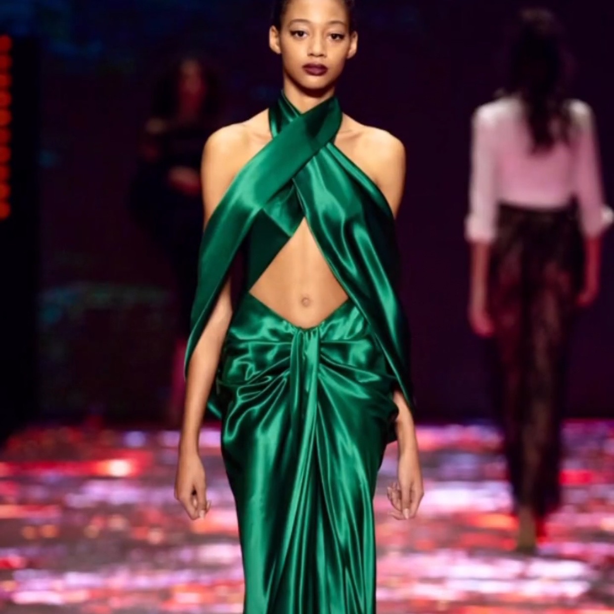 An handwork of finest Italian fabrics with precious crystals, featheres, hand painted detailsas a result of a strong, feminine woman.