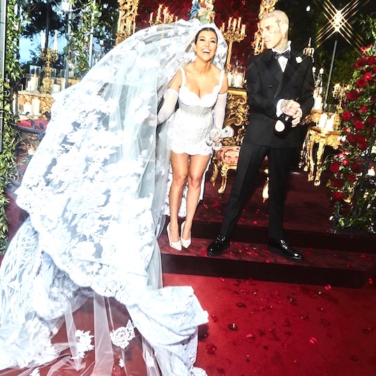 A stunning wedding style in Portofino. Kourtney Kardashian got married for the 3rd time with Travis Barker at Castello Brown with a silk lace and satin corset mini dress inspired by archival Italian lingerie.