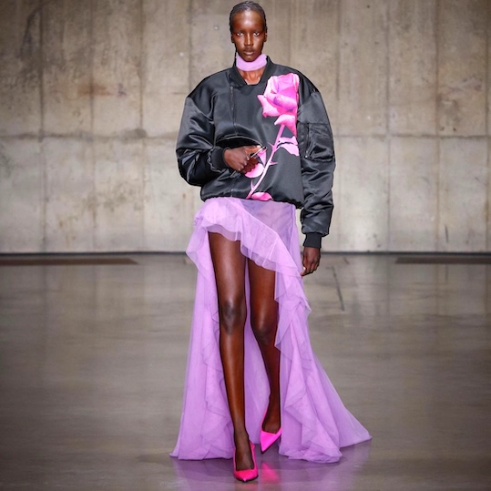 Lineup features layering of upholslery fabrics as jacquards draped into voluminous dresses, delicate embroideries into prim evening silhouette, A-line coats and florals patchworked.