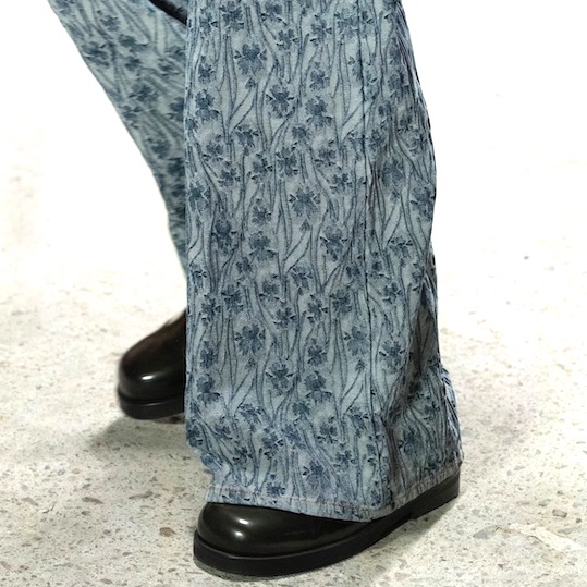 A wardrobe of masculine tailored suits worn with foulard shirts, sweaters with colored waves, fluid jumpsuits and kilt-trousers with front slits.