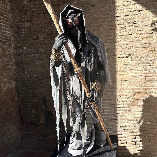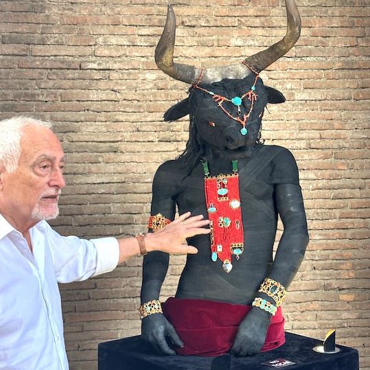 The journey ends with the Minotauro who is characterized by a pectoral jewel of corals, turquoises, garnets, agates, lapis lazuli, blue topaz, amethysts and other stones to express the fire of the river of blood.