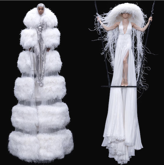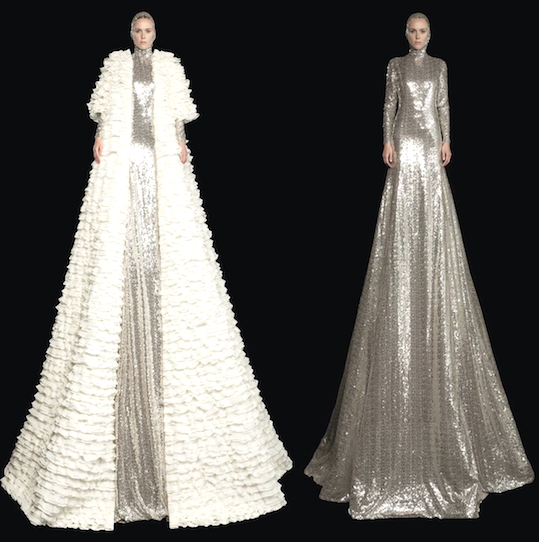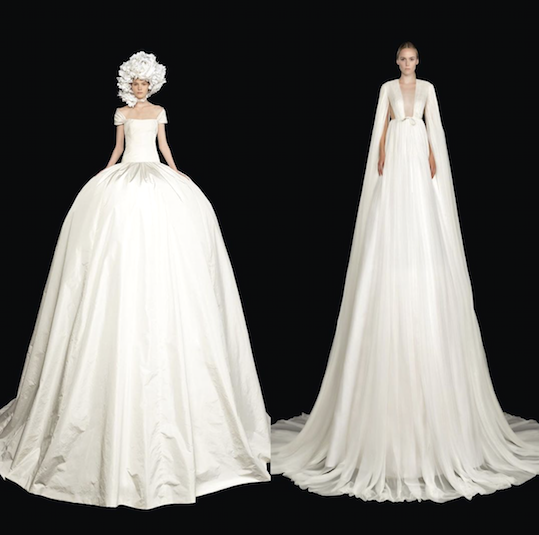 Taffeta, tundra, silk, sequined and immacule white tulle bustier dress, each as elongated as they are intricate.
