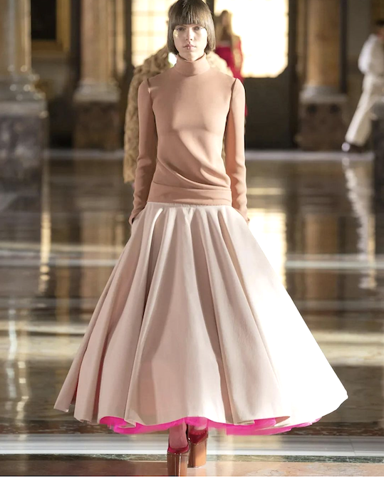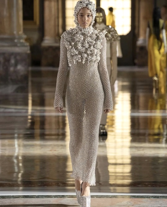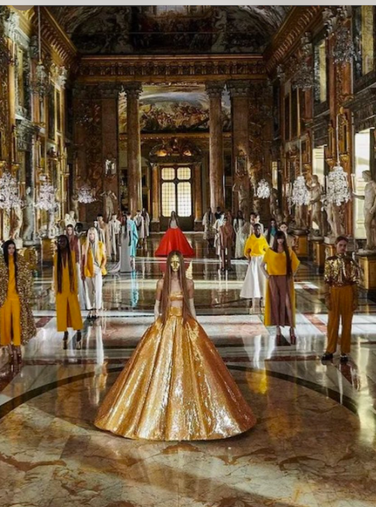A beautiful runway look for Valentino haute couture collection spring 2021 with the baroque splendor of the Galleria Colonna in Roma as background.