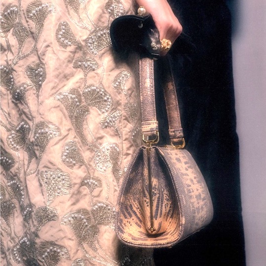 Gherardo Felloni, the creative director of Roger Vivier, bringing a modern approach since the begin and now presented a "choc heel" for boots on the knee and handbags: a new soft leather that looks like silk and velvet.
