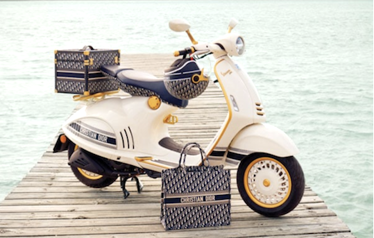 Dior and Vespa were founded both in 1946. Both are celebrating their 75 anniversary working on a scooter in limited edition and a line of accessories.