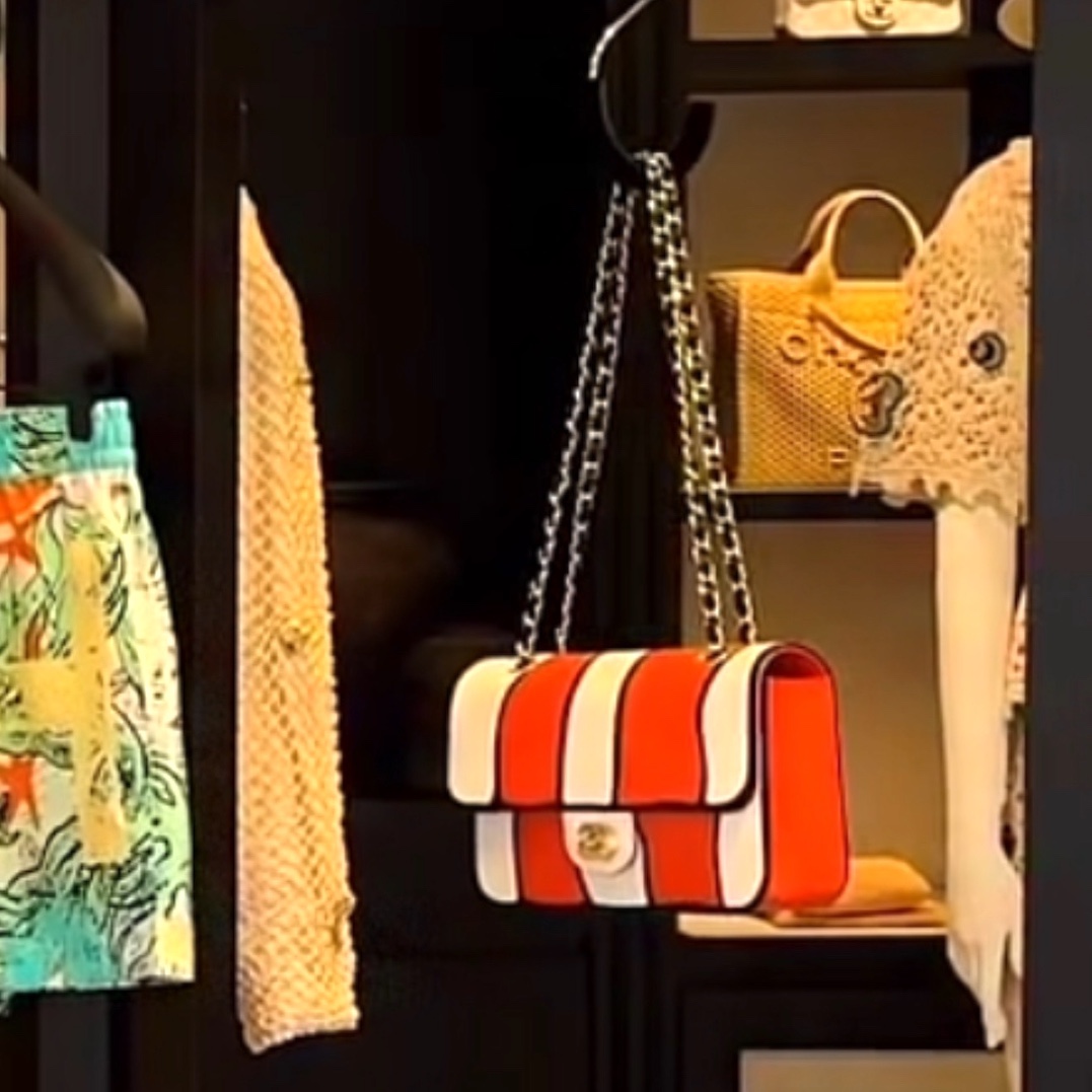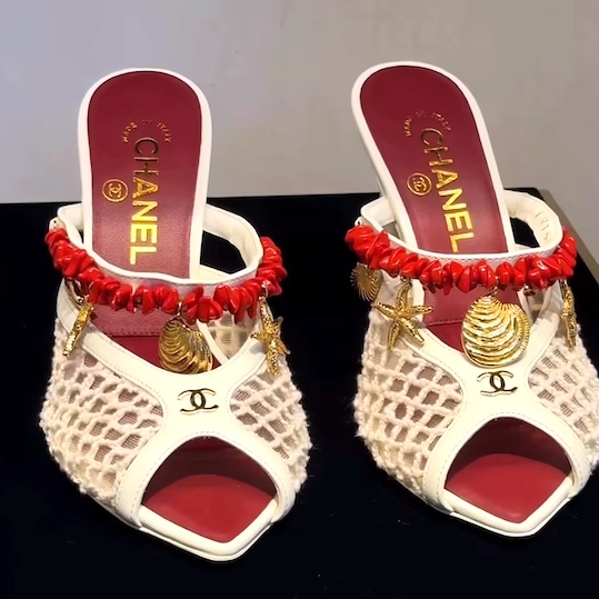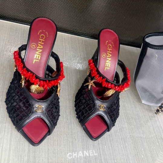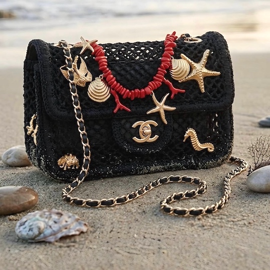 1,2 Chanel Coco Beach 2026: bag in black crochet design embellished with gold marine charms such as shells, starfish and red coral decoration