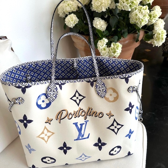 1,2 Chiara Ferragni with Louis Vuitton limited edition Neverfull bag dedicated to Portofino