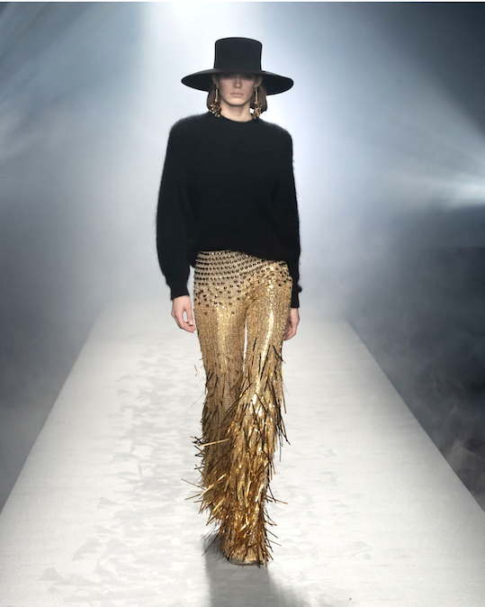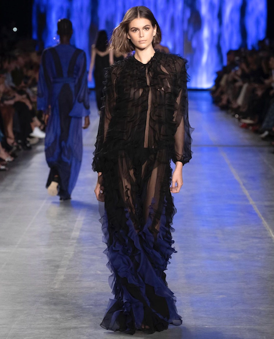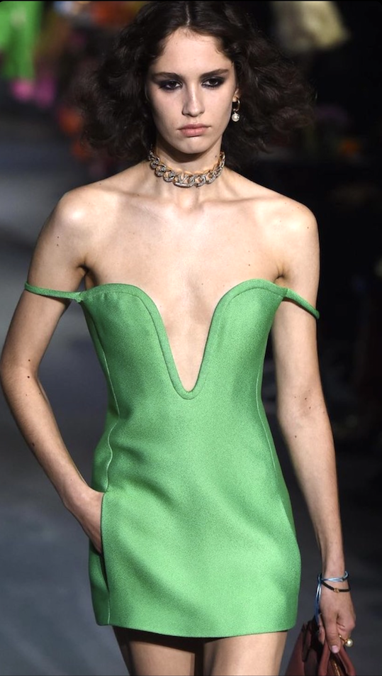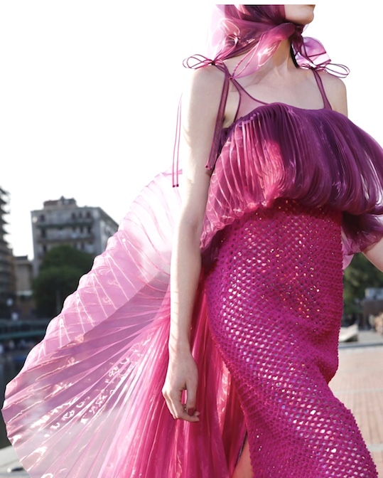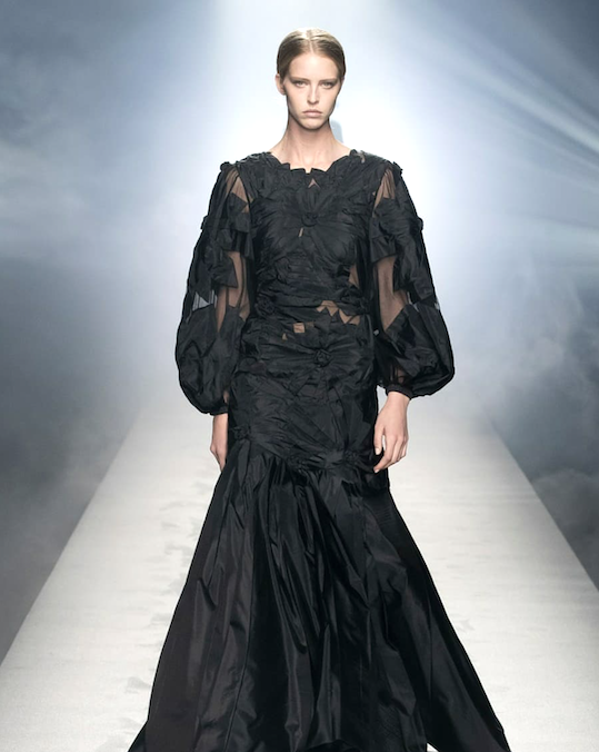 1. Noemi in a gown with graphic cut cuts and criss cross neckline detail
