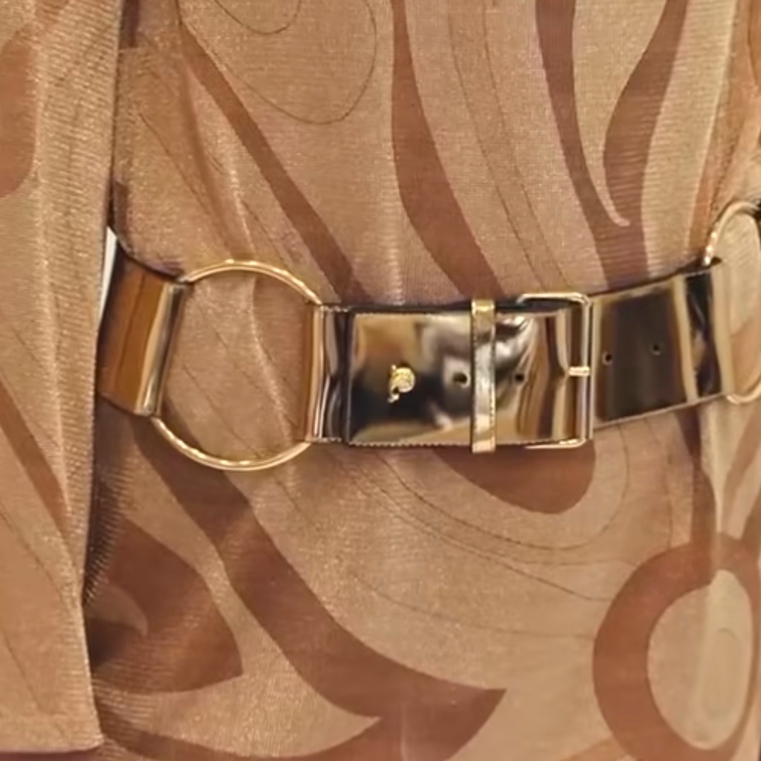 1,2 A marmo print lamè dress with a patent leather belt for the golden hour