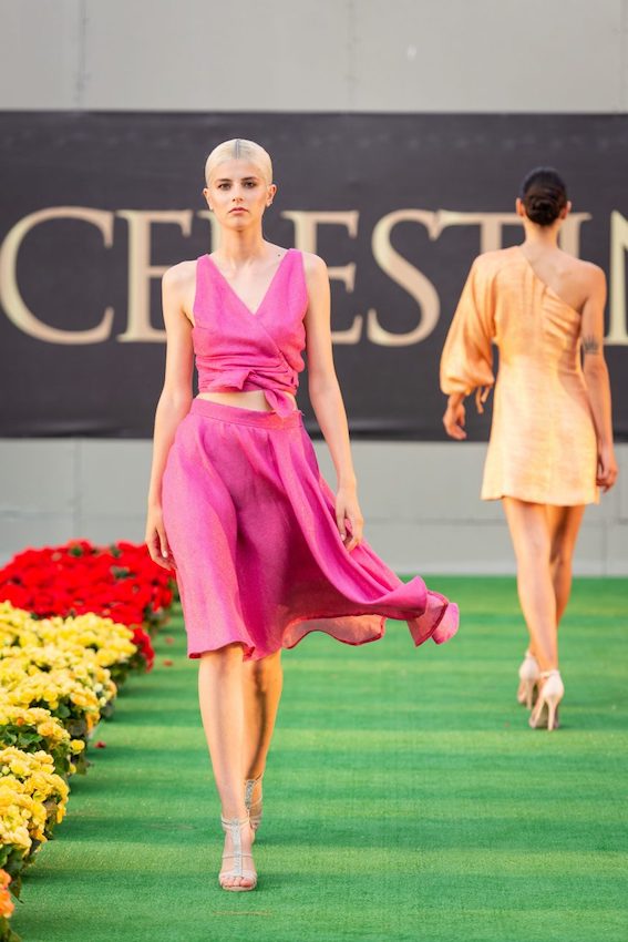 A romantic sunset introduced the elegant and harmonious style in fluid silks and linen. Chromatic solar light colors as yellow, orange and coral fuchsia for "Golden hour" spring-summer 2020 collection. A fascinating, emotional show.