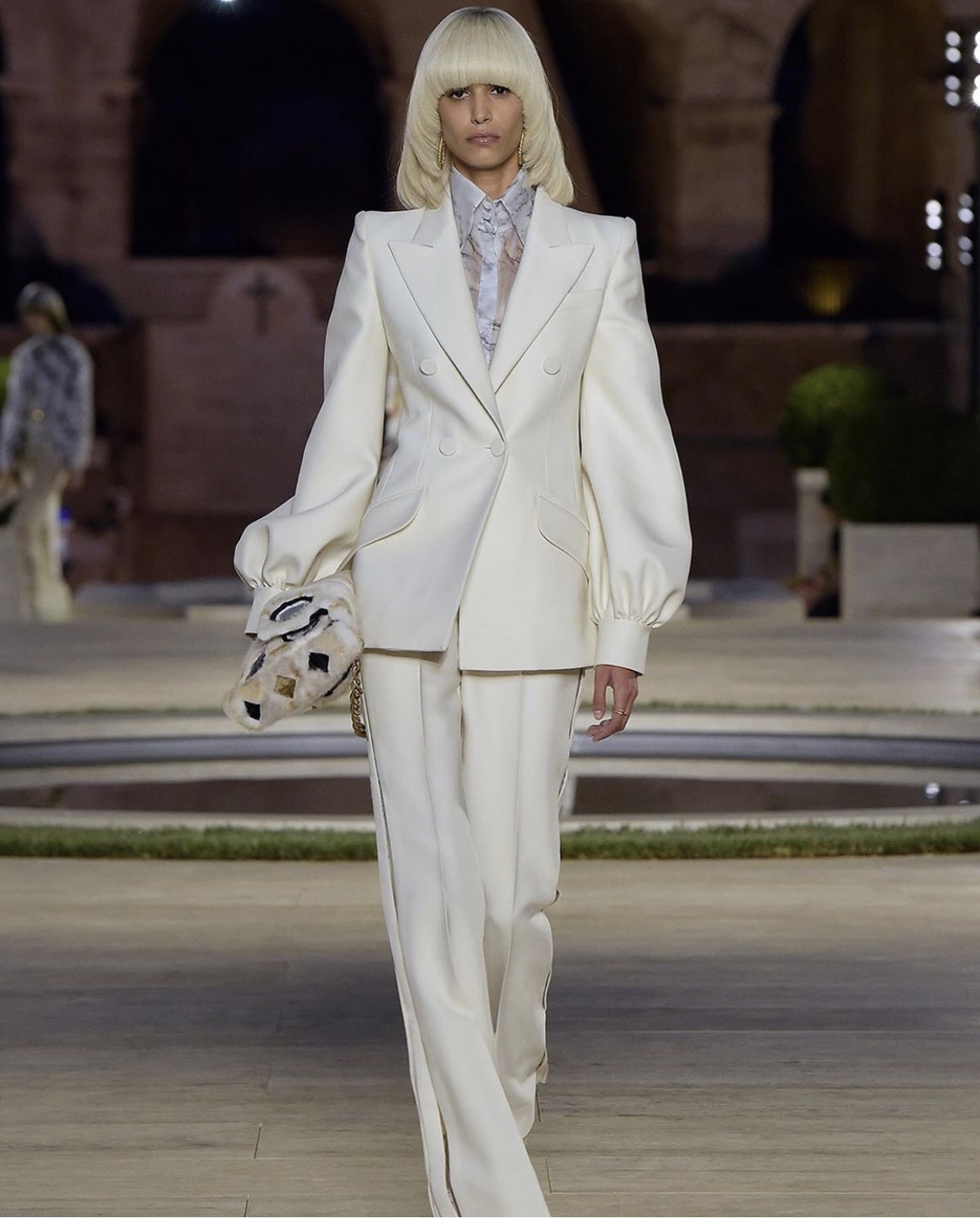 An elegant Fall 2019-20 Couture on Palatin Hill with a complex intarsia work that looked from a far like geometric prints. The opening looks homage Lagerfeld early '70 glory years: an all white suit with flared jacket sleeves and wide boot leg pants. Lighter and reversible maxi coats with fur strips and marble like details; evening gowns, chiffon embroidered and supreme ballgowns on models sporting pageboy cuts.