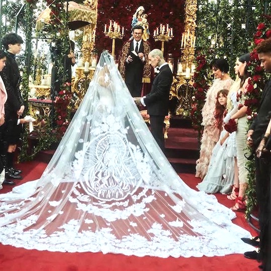 A stunning wedding style in Portofino. Kourtney Kardashian got married for the 3rd time with Travis Barker at Castello Brown with a silk lace and satin corset mini dress inspired by archival Italian lingerie.