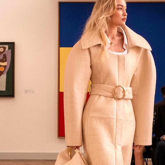 Gigi Hadid, opened the show dressed in an eggshell yellow coat, setting the tone of what was to come with voluminous shoulder pads, pencil skirts and boxy silhouettes as an homage to the 80s.