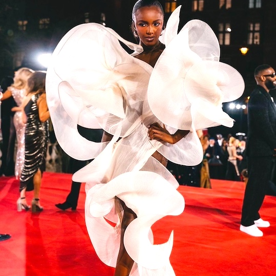 1. Mona Tougaard in a long body con dress in black mesh jersey Schiaparelli