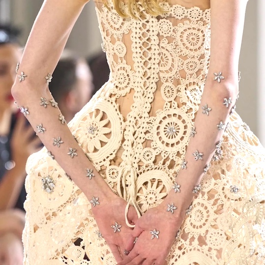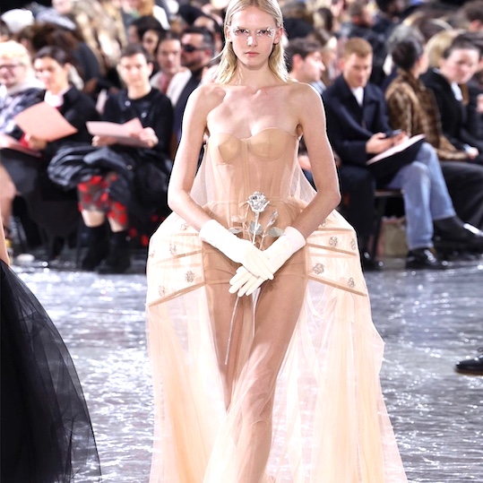 Silver, shiny, mirrored roses in the hand of the models and sensual corset laced, beautiful dandelion feather poms, embroidery details. So many amazing dresses tp love