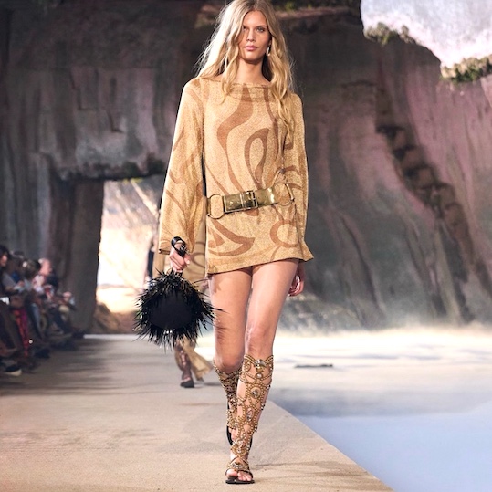 1,2 A marmo print lamè dress with a patent leather belt for the golden hour